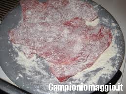 [dropcap]1[/dropcap] Infarinate la carne, facendo attenzione a eliminare la farina in eccesso. Qualora trovaste del grasso attorno al filetto potete a piacere eliminarlo o meno, questo servirà in fase di cottura ad evitare che la carne si arricci.