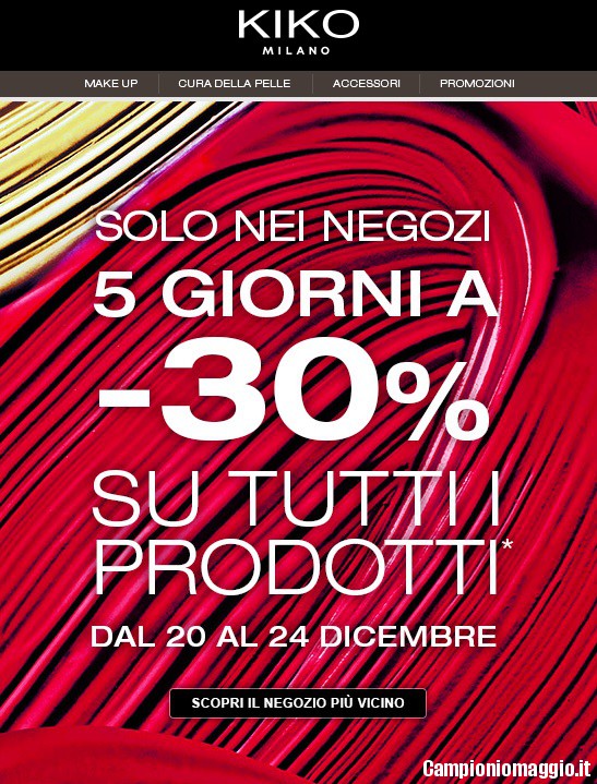 Abbiamo appena ricevuto una interessante newsletter Kiko, che ci avvisa che dal 20 al 24 dicembre, nei punti vendita sarà applicato uno sconto del 30% su tutti i proodotti: make up, cura della pelle, accessori. Da quanto indicato nella newsletter non sarà necessario presentare nessun coupon per ottenere lo sconto sullo scontrino, ma solo fare acquisti nei giorni prestabiliti.