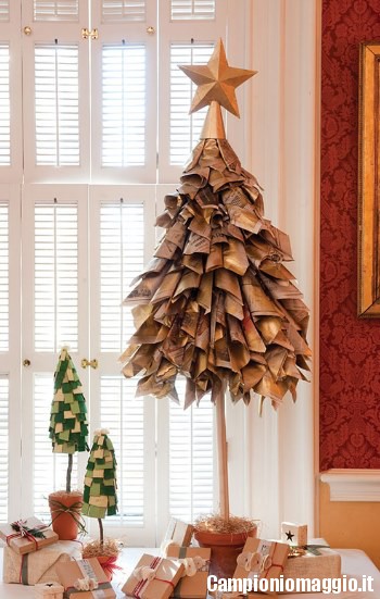 [dropcap]A[/dropcap]lberello di carta riciclata. Quella di utilizzare fogli di giornali vecchi è un’idea ecologica e simpatica. Il tronco può essere creato con un ramo o un manico di scopa, piantato all’interno di un vaso in ceramica contenente sabbia. La forma ad ombrello viene realizzata sovrapponendo fogli di carta arrotolati fino a formare un cono. In cima si fissa il tutto con della colla e si termina con una grande stella di carta pesta. Per dare un tocco in più si può spruzzare l’intera struttura con della vernice dorata e tanti glitter.