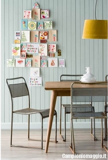 [dropcap]U[/dropcap]n abete d’auguri. Ogni anno si ricevono diversi biglietti di auguri che finiscono per essere conservati ed accumulati con il tempo. Possono essere riciclati utilizzandoli per costruire il proprio alberello di Natale. Si possono incollare artisticamente al muro, alternando diverse forme e decorazioni, formando una piramide. Non solo sarà un albero bello da vedere, ma avrà anche un significato affettivo particolare.