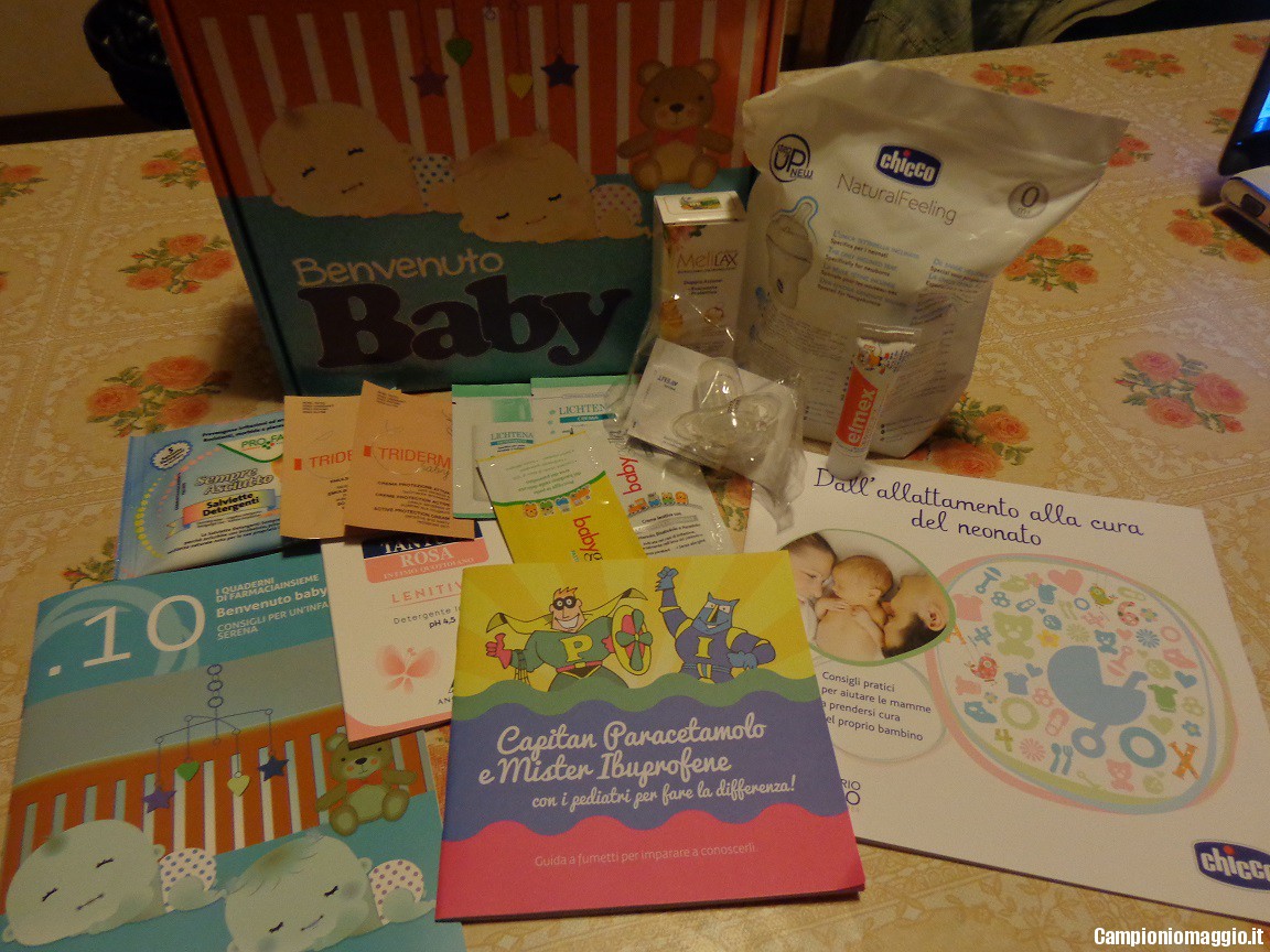 Claudia ci scrive “Il cofanetto contiene una ciuccio della Chicco con tettarella reclinata e opuscolo prodotti chicco, un ciuccio Avent no BPA, un campione di salviette detergenti Sempre Asciutto, un campioncino di pasta protettiva baby gella, due campioncini di crema triderm baby, un campione di tantum rosa, due campioni di lichtena una crema e un detergente, un campioncino di melilax e un campioncino di dentificio bimbi elmex fino ai 6 anni con opuscolo. Ma niente buoni sconto”.