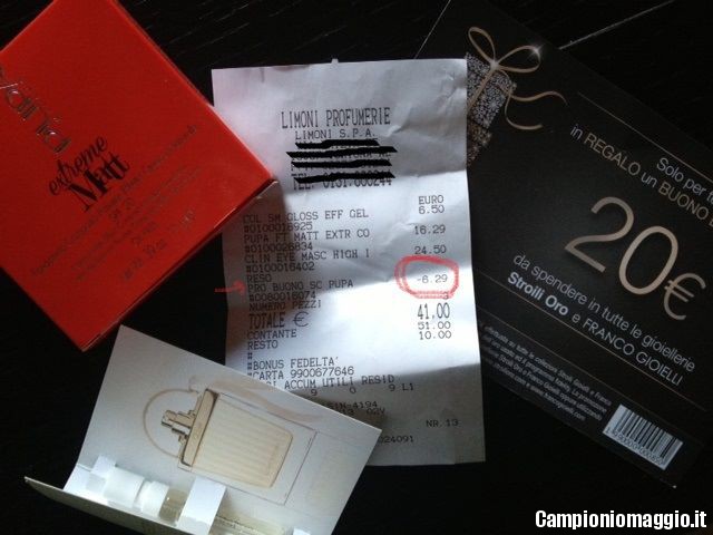 La settimana scorsa quando sono andata in una profumeria Limoni per utilizzare il buono Pupa Milano #aciuscunoilsuo, avevo ricevuto un coupon di 20 euro da utilizzare nei punti vendita Stroili Oro. Pensavo fosse un’iniziativa promozionale di quel singolo punto vendita, invece oggi ho ricevuto la newsletter che mi avvisa dell’iniziativa promozionale indetta da Limoni/La Gardenia/Stroili Oro su tutto il territorio nazionale.