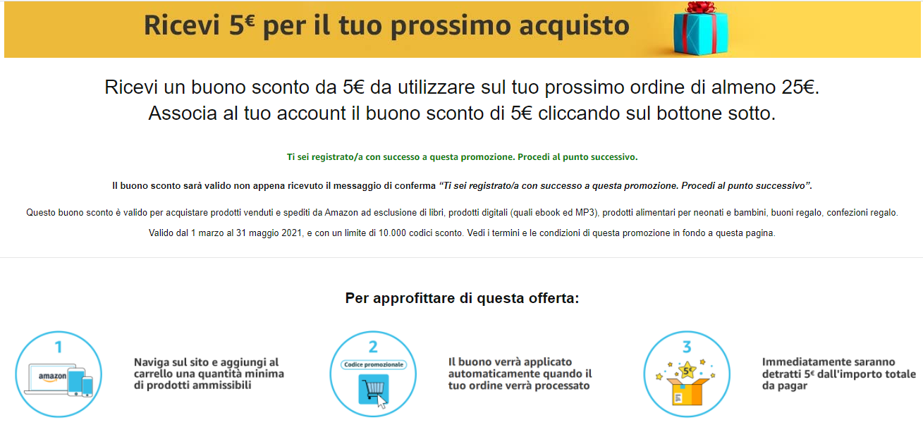 Hai visto la nuova promozione Amazon? Puoi richiedere subito un buono di 5€ da utilizzare sulla tua prossima spesa di 25€.