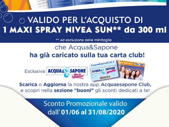 Il buono è valido sui maxi spray NIVEA da 300 ml. Il coupon Acqua&Sapone è già attivo sulla mia carta Club, mi basterà aggiornare l’app per vederlo nella sezione buoni.
