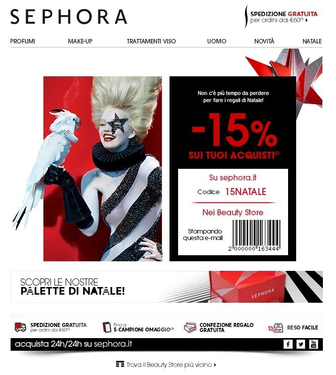 La newsletter è quella che trovate qui sotto e che dovreste aver ricevuto se siete iscritti alla newsletter Sephora. Per acquistare sullo shop online dovrete semplicemente inserire il codice sconto 15NATALE nell’apposito spazio, mentre per acquistare nei Beauty Store Sephora vi basterà presentare la mail contenente il codice a barre.