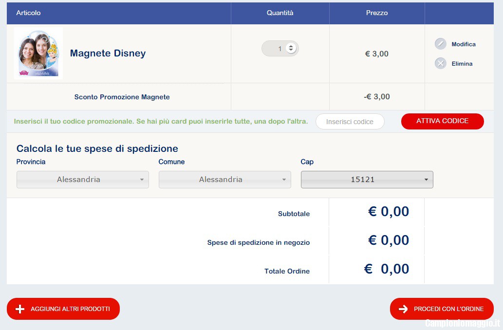 A questo punto ti verrà chiesto di accedere con il tuo Account Rikorda o se sei un nuovo utente, di procedere con l’ordine registrandoti. Una volta nel carrello vedrai azzerati tutti i costi e potrai decidere se ritirare gratuitamente la calamita Disney in un negozio convenzionato della tua città o riceverla a casa con corriere.
