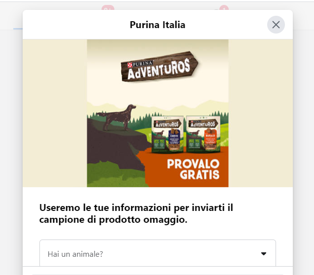 Il post per la richiesta dei campioncini è sponsorizzato, quindi visibile solo a chi e fan della pagina Purina Italia. Ti consigliamo di mettere like se ancora non lo hai fatto.