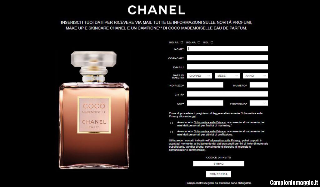Come accade sempre con le mail di Chanel, possono richiedere l’omaggio solo coloro che hanno ricevuto il messaggio e il codice univoco (utilizzabile una sola volta) per completare questo form. Offerta gratuita senza obbligo d’acquisto, riservata a persone maggiorenni, residenti in Italia. Fino ad esaurimento scorte.