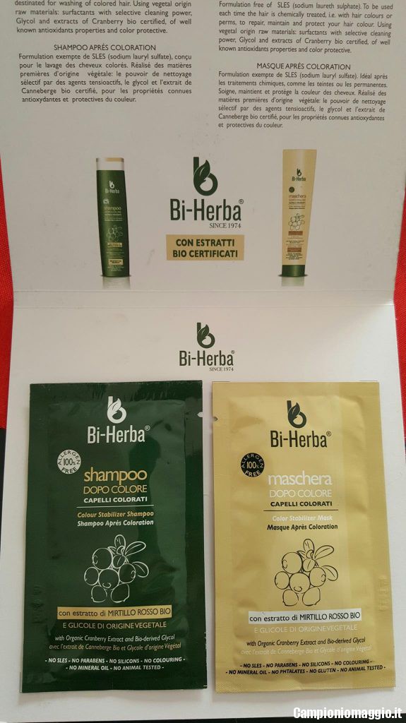 Basta collegarsi a questo indirizzo e compilare il form con i dati richiesti per ricevere a casa due bustine di prodotto Bi-Herba come quelle che vedere in foto. Il kit offerto contiene uno shampoo idratante e nutriente, che prolunga la lucentezza dei capelli colorati e una Maschera Dopo Colore a base di estratto di Mirtillo Rosso 100% BIO sigilla le cuticole dei capelli e aiuta a fissare il colore.