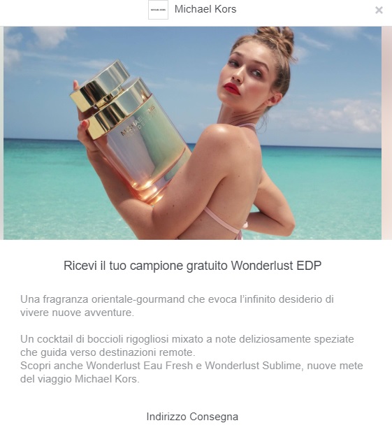Navigando su Facebook abbiamo trovato casualmente un post sponsorizzato di Michael Kors che ci invitava a richiedere un campione omaggio della fragranza femminile Wonderlust.