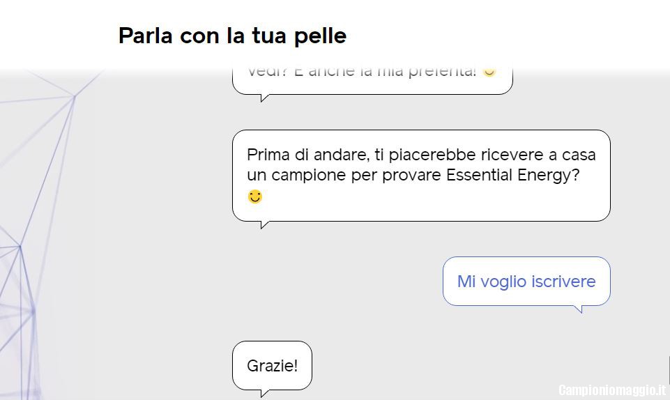 Collegati a questa pagina e inizia la chat con la tua pelle (lo so è surreale). Al termine di una serie di botta e risposta potrai chiedere il campioncino del nuovo trattamento viso Shiseido ispirato sia dalle conoscenze dermatologiche sia della neuroscienza, con la nuovissima tecnologia ReNeura Technology.