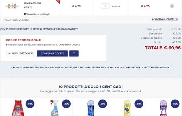 Qui sotto, nella foto vedete il totale dell’ordine che abbiamo appena effettuato: spedizione gratis, sconto di 5 euro grazie al codice ottenuto via mail con l’iscrizione e 10 prodotti a scelta a 1 centesimo. Non male!