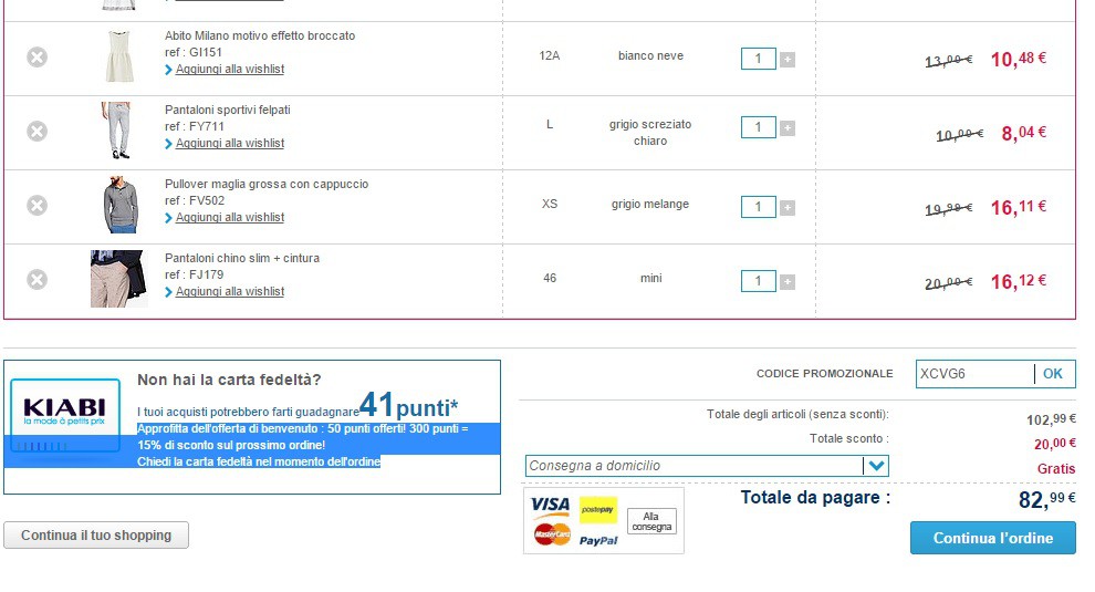 I prezzi dell’abbigliamento Kiabi sono contenuti, ma se vuoi risparmiare ulteriormente, clicca qui e utilizza il codice sconto XCVG6, per ottenere uno sconto di 20€ di sconto per un acquisto minimo di 100€ (offerta non valida sugli articoli in promozione e sugli articoli esclusivi web).