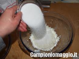 [dropcap]3[/dropcap] Una volta che il composto è diventato più omogeneo versarvi dentro l’intero contenuto della prima terrina, cioè farina, zucchero, lievito e vanillina e amalgamare bene il tutto.