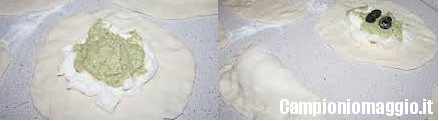 [dropcap]4[/dropcap] Una volta che le palline saranno lievitate, stendetele a formare un disco, e ponete al centro la mozzarella, lo squacquerone, il patè di carciofi ed alcune rondelle di olive nere. Chiudete i panzerotti, ripiegando i bordi con attenzione, e sigillateli con l’aiuto di una forchetta.
