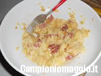 [dropcap]2[/dropcap] In una terrina abbastanza larga rompere le uova e incorporare il parmigiano grattugiato, il sale, il pepe e i cubetti di salame. Con una forchetta sbattere energicamente il composto, avendo cura di mescolare in maniera omogenea gli ingredienti.