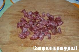 [dropcap]1[/dropcap] Con un coltello ben affilato tagliare a cubetti di piccole dimensioni il salame e metterlo da parte.