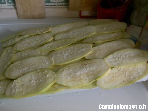 [dropcap]1[/dropcap] Lavate con cura una melanzana e privatela del picciolo. Su un piano di lavoro tagliatela in dischi dello spessore di circa cinque millimetri e riponeteli in un recipiente. Cospargete ogni strato con mezza manciata di sale grosso e coprite il tutto con un coperchio, lasciando riposare per circa venti minuti: questa operazione servirà a far perdere all’ortaggio il liquido in eccesso.
