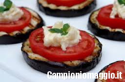 [dropcap]3[/dropcap] Dopo averli lavati, affettate i due pomodori in dischi circolari e metteteli da parte. Nel frattempo, scaldate la griglia e scottate le melanzane da entrambi i lati. Per renderle più saporite ed evitare che si attacchino alla piastra di cottura potete ungerle con un filo di olio d’oliva.