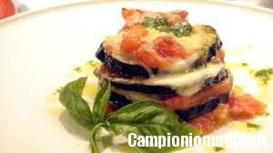 [dropcap]4[/dropcap]Preparate una teglia proteggendola con un foglio di carta da forno e iniziate a comporre le vostre mini porzioni di parmigiana. Iniziate con un disco di melanzana grigliata, aggiungete un cucchiaino di basilico frullato, un disco di pomodoro e una spolverata di ricotta salata. Terminate con un altro disco di melanzana, salsa al basilico, pomodoro e ancora ricotta salata. Siate generosi! Se volete potete aggiungere al vostro piatto un pizzico di pepe.