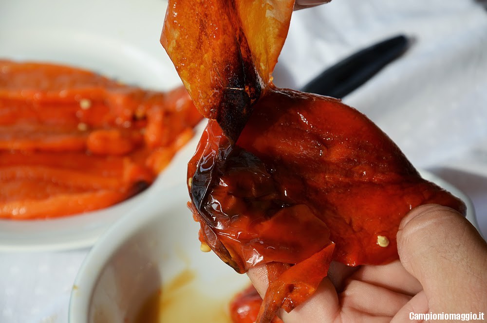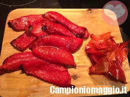 [dropcap]1[/dropcap] Lavare accuratamente i peperoni e asciugarli con un panno, in seguito riporli su una teglia e infornarli, il forno dovrà essere preriscaldato a 240°. Lasciarli cuocere per circa venti minuti avendo cura di rigirarli frequentemente durante tutto il tempo di cottura previsto. Tale accorgimento consentirà di cuocere uniformemente i peperoni su ogni lato. Al termine della cottura i peperoni dovranno apparire leggermente scuriti da tutti i lati.