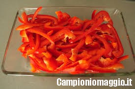 [dropcap]3[/dropcap] Spellare i peperoni, quindi tagliarli in due, per il senso della lunghezza, e rimuovere i semini e i filamenti presenti all’interno. Sciacquarli accuratamente e tagliarli in piccole listarelle da riporre in un recipiente alto e stretto.