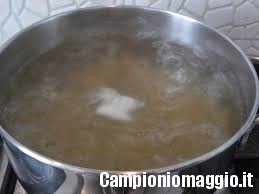 [dropcap]5[/dropcap] Cuocere la pasta, fusilli o penne, scolandola circa due minuti prima del tempo di cottura riportato sulla confezione. Si consiglia di conservare a parte un bicchiere d’acqua di cottura.