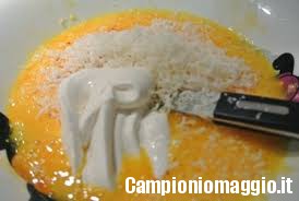 [dropcap]2[/dropcap] Nel frattempo, iniziate a sbattere le due uova in un recipiente abbastanza capiente da contenere man mano, l’aggiunta della panna, del sale e del pepe fino ad ottenere una sorta di crema ben amalgamata.