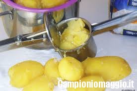 [dropcap]2[/dropcap] Private le patate della buccia e riducetele a purea in una terrina. Potete aiutarvi con un passaverdure o con l’apposito schiacciapatate.