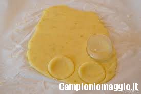 [dropcap]4[/dropcap] Su un piano di lavoro protetto da un foglio di carta da forno, stendete il vostro impasto servendovi di un mattarello di legno, finché non raggiungerà lo spessore di circa mezzo cm. Con l’aiuto di un coppa pasta di circa 6 cm di diametro ritagliate le vostre faccine. Il composto in eccedenza potrà essere facilmente reimpastato per ricavare altri dischetti.
