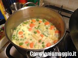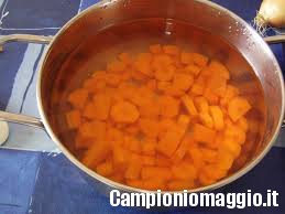[dropcap]2[/dropcap] Prendete le carote, sbucciatele con un pela patate e riducetele a dadini. Cercate in qualche modo di fare cubetti piccoli in modo da eguagliare i tempi di cottura degli altri ingredienti. I piselli sarebbe meglio se fossero freschi ma se non li avete, vanno bene quelli surgelati.