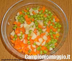 [dropcap]3[/dropcap] Unite quindi tutti gli ingredienti versandoli in una pentola con 3 dita di acqua leggermente salata, insieme ai piselli. Lasciate cuocere per circa 6-7 minuti coprendo con un coperchio. Terminata la cottura scolate le verdure aiutandovi con uno scolapasta e adagiatele in una terrina. Aggiungete le scatole di tonno sgocciolato e mescolate. Infine aggiungete i sottaceti e il mais precedentemente lavato e liberato dell’acqua in eccesso.
