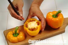 [dropcap]3[/dropcap] Quindi, riempire i peperoni con questo composto e, se i peperoni sono stati tagliati a metà spolvere col pangrattato, altrimenti coprire con la punta della calottina del peperone che avevamo tagliato.