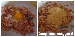 [dropcap]2[/dropcap] Proseguire poi aggiungengo alla carne sia di vitello che di manzo, l’uovo, la mollica ben spezzettata, il sale, il pepe e del formaggio, regolandoci con la consistenza dell’impasto: se è troppo dura, aggiungere del latte aiuterà ad ammorbidire il tutto.