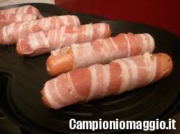 [dropcap][/dropcap] Farciteli con delle fettine di emmentaler, precedentemente tagliate, all’interno delle tasche che avevate creato con l’incisione. Poi avvolgete al centro ogni wurstel con una fettina di pancetta o bacon, stringendolo delicatamente in modo da richiudere il più possibile il wurstel.