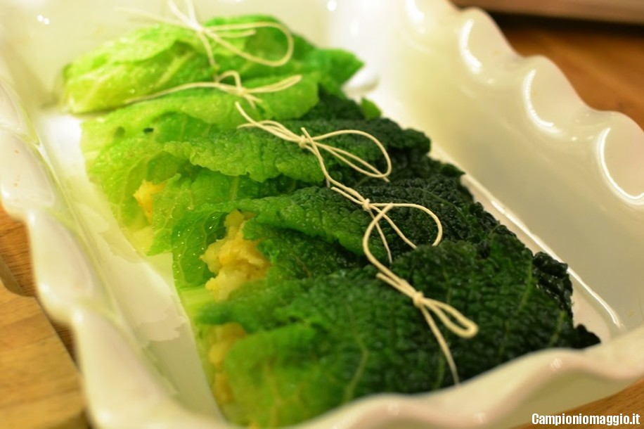 Unite la verza con il pane ormai impregnato di latte e aggiungete, insieme alle patate, olio, parmigiano e uovo. Anche un pizzico di sale se ritenete necessario! Amalgamate il tutto. Inserite il ripieno all’interno delle foglie esterne ripulite dalla crosta dura e avvolgete la vostra creazione fissandola con lo spago da cucina.