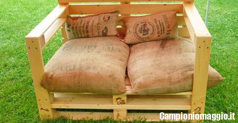 [dropcap]4[/dropcap] Anche l’arredamento può essere creato dai materiali di riciclo, come le sedie in pallet: funzionali, robuste, comode e con colori caldi danno un tocco molto particolare all’ambiente. Allo stesso modo con il pallet si può ottenere un divano con cuscini fatti di sacchi.