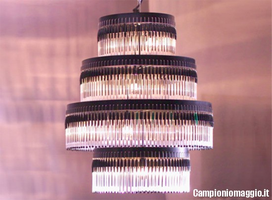 [dropcap]5[/dropcap] Dopo aver fissato tutte le penne, potrete appendere il supporto alla struttura del lampadario, sostituendolo al vecchio paralume. Fate in modo che la lapada a sospensione rimanga all’interno del cilindro realizzato con le Bic. Per ultimare questa fase potete utilizzare un saldatore o piccoli pezzi di fil di ferro: il consiglio è quello di evitare la colla, che a lungo andare potrebbe sciogliersi per il calore della lampada e far cadere il paralume. Infine, accendete il vostro lampadario green e godetevi gli spettacolari riflessi della luce che attraversa i tubicini pendenti: direste mai che una volta erano delle semplici penne Bic?