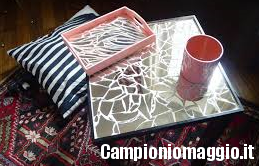 [dropcap]1[/dropcap] MOSAICO. Bisogna raccogliere e riordinare i pezzi di specchio in una sorta di “puzzle imperfetto”, secondo i nostri gusti, sopra una superficie di nostro gradimento, ovviamente appiccicandoli con un apposita colla o adesivo. Sarà un’idea creativa per cornici, quadri, superfici di tavoli, piastrelle e staccionate.
