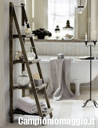 [dropcap]1[/dropcap] La scala porta asciugamani. Quante volte nei bagni delle nostre case troviamo installati dei porta asciugamani che non ci convincono ? Quelli fissi al muro sono troppo scontati, quelli a piedistallo ingombrano troppo. Ci vorrebbe proprio un’idea originale. Perché non utilizzare allora quella vecchia scala a pioli rimasta ormai abbandonata in soffitta? Adattarla all’ambiente non sarà poi troppo complicato. Basterà restaurare il legno, se rovinato, e ridipingerla con colori adatti all’ambiente.
