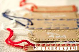 [dropcap]4[/dropcap] Etichette regalo. Dai vecchi biglietti si possono ricavare delle strisce colorate, lunghe circa 12 cm e larghe 5. Vanno poi piegate al centro per ottenere uno spazio bianco in cui scrivere la dedica. Mantenendola piegata, la striscia di cartoncino va forata con la bucatrice a sinistra nella parte altra, da dove poi passerà un nastrino.