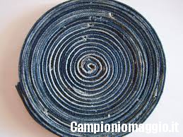 [dropcap]3[/dropcap] Se ciò che volete è un originale sotto-pentola o un sotto-bicchiere, quello che dovete fare è ritagliare gli orli delle gambe, poi arrotolarli e incollarli.