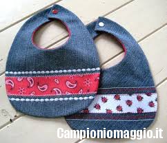 [dropcap]4[/dropcap] Da un paio di vecchi jeans si possono ricavare anche dei bavaglini per bambini; ciò che bisogna fare è ritagliare dai pantaloni delle forme tonde, a cui poi verrà applicata un po’ di stoffa colorata, per rendere il bavaglino più vivace. Per la chiusura ci possiamo affidare a dei bottoncini a clip, più pratici da usare, oppure a dei bottoni colorati.