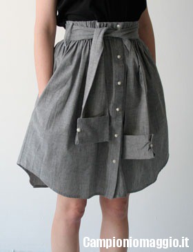 [dropcap]1[/dropcap] Gonna: per creare una gonna bisogna utilizzare la parte centrale della camicia, destinando polsini e maniche alle decorazioni. Come riferimento per le misure si può prendere una gonna già in possesso.