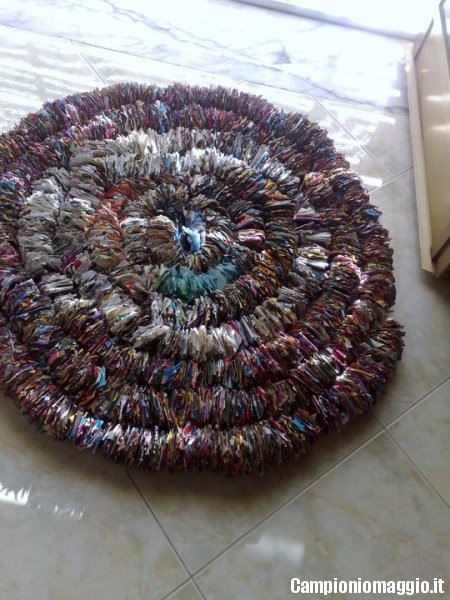 [dropcap]2[/dropcap] Per chi ha gatti in casa, la creazione di un tappeto o uno zerbino sostituisce egregiamente l’albero tiragraffi, oltre a svolgere efficacemente la sua funzione davanti alla porta d’entrata. Qualsiasi creazione deve essere consolidata con una semplice procedura: dopo aver spalmato di colla vinilica, appena diluita, entrambe le parti, si vernicia con un colore acrilico o trasparente. La carta, così trattata, ha la consistenza e la resistenza di un tessuto, può essere aspirata e spazzata ed è naturalmente anallergica.