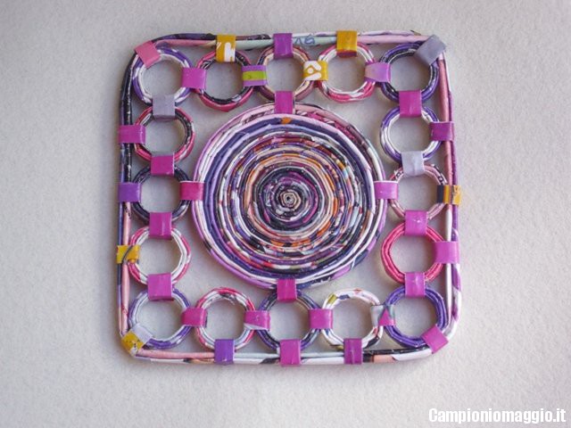 [dropcap]3[/dropcap] Dei bellissimi sottopentola, da realizzare in pochi minuti, si ottengono unendo a fiore delle rotelle di cannucce del tutto simili, nella forma, alle stelle filanti. Per facilitare l’avvolgimento, si possono usare delle bottigliette di diverse dimensioni, avendo l’accortezza di fissare il lavoro con la colla a caldo man mano che si procede.