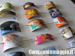 [dropcap]8[/dropcap] Con le card è possibile realizzare anche dei bracciali estremamente decorativi. Basta ritagliare le tessere a quadratini o nelle forme che preferite, praticare un buco al centro e infilarle in un elastico. Potete anche dare un tocco particolare alternando perle colorate, pietre o pezzi di legno.