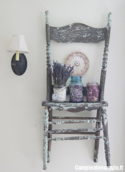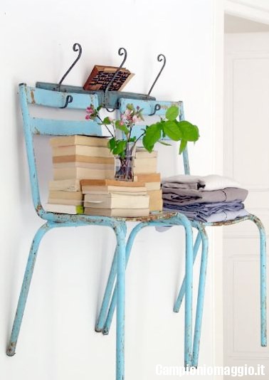 Le sedie di legno dall’aspetto vissuto, magari quelle verniciate con tinte dalle tonalità pastello ormai un po’ scrostate, possono essere trasformate in perfette mensole shabby chic. Come? Potete appenderle al muro esattamente come sono, facendo aderire lo schienale alla parete e utilizzando la seduta come ripiano porta oggetti: saranno perfette per riporre libri e soprammobili che richiamino lo stesso stile della sedia. Utilizzate all’esterno, invece – per esempio sui muri della veranda – possono ospitare vasi con fiori e piccole piantine aromatiche. Per rifinire l’aspetto della vostra mensola potete divertirvi a decorarla nei colori che preferite e segare via le gambe, che potranno essere riutilizzati per altri impieghi.