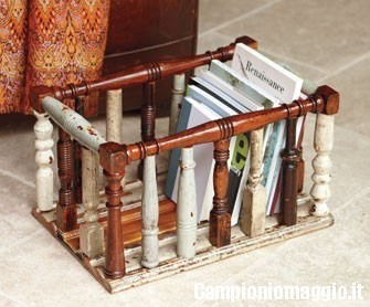 Se avete a disposizione alcune vecchie sedie di legno che avete intenzione di eliminare, prima di buttarle asportatene le spalliere: potranno esservi utili per costruire un simpatico porta-riviste. Anche in questo caso avrete la certezza di arredare il vostro salotto con un oggetto davvero unico. Su una base quadrata (o rettangolare) di legno o compensato, fissate lungo il perimetro quattro spalliere – o porzioni di spalliere – delle vostre sedie, dopo aver avuto cura di segarle tutte della stessa lunghezza. Otterrete così una sorta di cestino, di cui le spalliere costituiranno le pareti: sarà un pratico contenitore per riporre giornali e riviste.