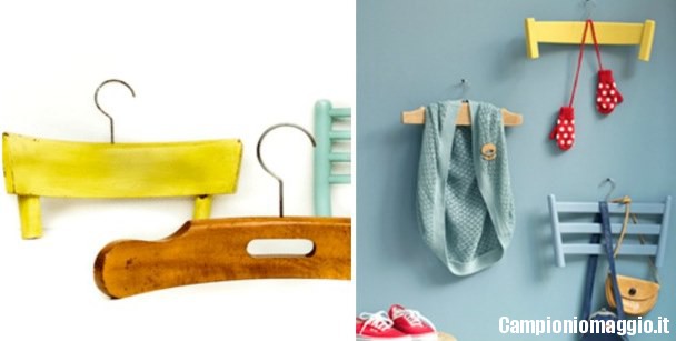 La parte superiore della spalliera di una sedia di legno può essere riutilizzata come perfetta gruccia per appendere gli abiti. Si tratta di un riutilizzo veloce e molto efficiente, perché le spalliere sono concepite per assecondare la forma naturale delle spalle: proprio per questo sapranno mantenere giacche e camicie sempre in perfetta forma. Vi basterà rimuovere dalla spalliera la traversina superiore e aggiungere al centro un gancio metallico ben avvitato nel legno, che permetta di appendere la vostra gruccia. Il tocco in più? Decorarle in diversi colori, utilizzando vernici rigorosamente naturali a base d’acqua e lasciandole asciugare alla perfezione prima di riporle nell’armadio.
